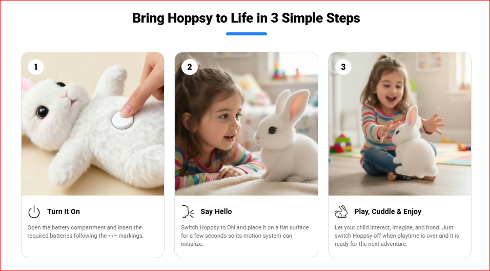 The toy uses small motors and sensors that detect when children interact with it. When a child pets the bunny or taps it gently, the robot responds with movements and sound effects.